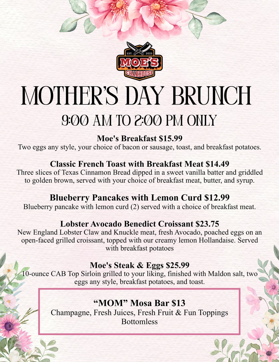 Skip the wait and treat Mom right. We're serving a special brunch menu from 9 AM to 2 PM. Top it off with our bottomless "MOM" Mosa Bar for $13.
