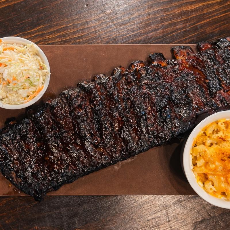 Using a secret family spice rub, cooked tender and juicy, glazed with Moe’s Jim Beam BBQ sauce. Served with mac n cheese and cole slaw